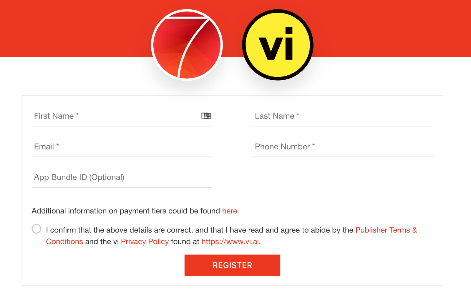 First of all as a mobile publisher you need to create vi publisher account. To signup for Framework7 vi account go to vi.framework7.io and fill up the following form: